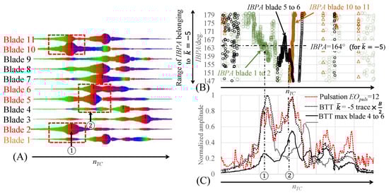 Comparison between BTT individual and traces with pulsation EOpuls = 12 order tracking result (first flap mode along EO = 6). (A) overall blade response; color indicates vibration phase transition. (B) selected IBPA trends over turbocharger revolution speed focusing on the IBPA range for . (C) blade vibration mode amplitude trend overlayed with measured pulsation amplitude trend along EOpuls = 12. The ① and ② highlight resonance crossing point of blade 2, 10 and 11 or 5 and 6, respectively.