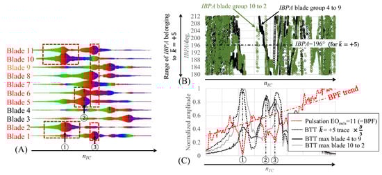 Comparison between BTT individual and traces with pulsation EOpuls = 11 order tracking result (first flap mode along EO = 6). (A) overall blade response; color indicates vibration phase transition. (B) selected IBPA trends over turbocharger revolution speed focusing on the IBPA range for . (C) blade vibration mode amplitude trend overlayed with measured pulsation amplitude trend along EOpuls = 11. The ①, ② and ③ highlight resonance crossing point of blade 2, 10 and 11 or 5 and 6, or the others, respectively.