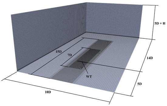 The computational domain was modeled following the sensitivity analysis of Troldborg et al. [] and is shown in Figure 3. For the generation of time-dependent turbulent inflow conditions, a precursor channel is included in the simulations, with the same cross-section dimensions, that spans 50 diameters (50 × 80 m) in the streamwise direction. The computational grid was generated by using the snappyHexMesh utility. A sensitivity analysis of the grid was carried out using WT power as the convergence parameter. Three grids were generated with rotor zone element sizes of 1.5, 0.75, and 0.375 m, respectively. From Figure 4, the second grid was selected, trading accuracy against computing time. This grid entails 6.1 M cells distributed across four layers of subsequent refinement. The height of the ground cells is 0.922 m. The rotor blades are discretized with 28 elements (1.4 m).
