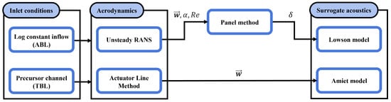 The adopted numerical method is presented in Figure 5. Specifically, the surrogate acoustics algorithm utilizes the fluid dynamic field resolved by the ALM to derive noise predictions. The local relative velocity, incidence, and Reynolds number from the ALM are input into Lowson and Amiet models. Boundary layer thickness, , is calculated using X-Foil []. The latter exploits the panel method, in which complex surfaces, such as airfoils, are discretized into a set of linear or curved panels. The panel method solves for the pressure and velocity distribution on each panel and then integrates these values to calculate the overall lift, drag, and other aerodynamic characteristics of the geometry. The sensitivity of the method to inflow conditions was investigated by considering two different cases: a stationary inflow with a typical logarithmic atmospheric boundary layer profile (ABL) and a time-dependent inflow derived from a precursor channel for proper turbulence development (TBL).