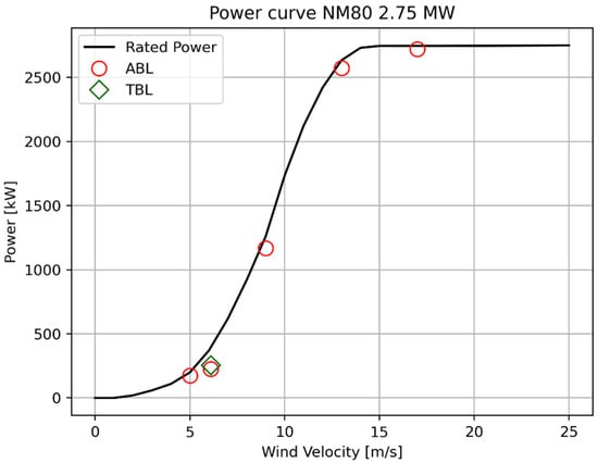 Comparison between the rated power and the computations: ABL inflow (red circles) and TBL inflow (green diamond).