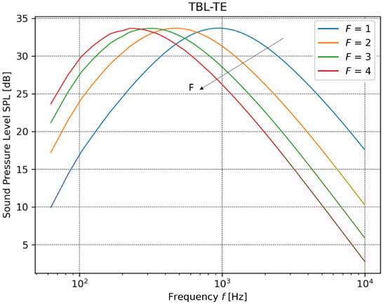 In the standard blade element momentum (BEM) theory, the boundary layer thickness, , can be computed by treating the airfoil as a flat plate. The accuracy of this method has, however, been the object of discussion by many authors [,]. In this work, an empirical multiplicative correction factor, F, is introduced, with a value ranging from 1 to 4. The parameter must be tuned according to reference data. In the test case, the peak frequency scales linearly with F from 1 kHz for to 230 Hz for , as reported in Figure 7. The maximum SPL is independent of the choice of F (34.7 dB).