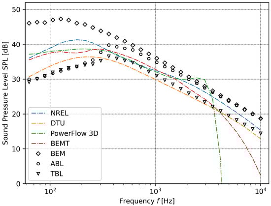 The capabilities of surrogate acoustics and the ALM are scarcely investigated in the literature. In Barlas [], LES computations with ALM modeling were used to compute blade relative velocity and the incidence and turbulence characteristics of each ALM element. These values are then fed as input to NAFNoise [] for SPL prediction. Zhu et al. [] evaluated the capabilities and limits of the ALM in LES computations by modeling the flow field that is required for long-distance acoustic propagation models based on an acoustics analogy, finding good agreement with the experimental data.