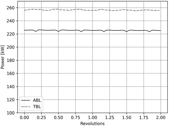 This section reports the comparison between the two different inflows for the wind velocity of 6.1 m/s. Figure 9 shows the instantaneous turbine power as a function of time. The results are in line with the averaged values reported in Figure 6. The TBL shows better agreement with the rated power, whereas the ABL inflow underpredicts the rated power by approximately 30 kW. In the ABL model, the interaction between the blades and the WT tower is evident, with a loss of 2 kW in three negative peaks per rotor revolution, corresponding to the blade passing frequency. This effect is dampened in the TBL model, which, instead, shows a higher variability in terms of turbine power due to the interaction of the blades with the inflow turbulent structures.