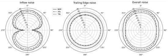 Figure 10 displays the computed SPL as a function of the azimuthal co-ordinate of the blade at 200 Hz, which corresponds to the Strohual peak frequency. The inflow noise shows the typical distribution of a dipole source, depending on the directivity term . The three models show a reduction in the inflow noise for a blade position corresponding to 90° and 270°, where the blade is parallel to the ground. The lowest maximum value of the SPL is 35 dB from the TBL case, while the simple BEM approach shows an overprediction at the peak frequency, reaching up to 42 dB. Instead, the trailing edge noise shows good agreement between the ABL and TBL simulations and has a mild dependency on the blade azimuthal co-ordinate. The computed trailing edge SPL is in the range of 31.3, 32.1, and 36.9 dB for TBL, ABL, and BEM, respectively. The computed overall SPL reflects the trend already seen in Figure 8, with the highest values found in the BEM a priori computations. The highest SPL corresponds to the blade at 0° and 180°, with the blade orthogonal to the ground. The causes of the differences among the different approaches can be investigated by further analyzing the derivation of the different parameters in Equations (1) and (7).
