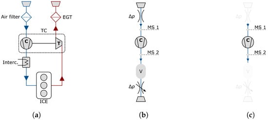Through the past years, the ratio of boosting internal combustion engines (ICE) has been increased gradually and the dynamic response behaviour has been improved significantly. This has been achieved by combining multiple sizes of turbochargers on the one hand and intelligent, closed-loop controls on the other hand. Even if the complexity has increased over the years, the basic principle of boosting an ICE is still the same and is depicted by a basic assembly diagram of a turbocharged ICE in Figure 1a.