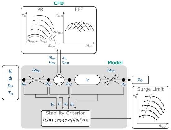 The procedure of the approach should be demonstrated by Figure 2. The core of it is the part highlighted by the gray box. This part basically represents the flow path including the compressor and flow variables like the pressure, temperature and velocity, which are calculated along this flow path. To do so, some information about the system is needed. Starting at the inlet, this is provided by a polynomial for the pressure loss as a function of mass flow rate for the intake section (labeled Inlet throttle in Figure 2). Information about the compressor wheel is provided as pressure ratio and isentropic efficiency , both versus corrected mass flow rate . This is the connection of steady-state CFD-simulations and the analytical model, or in other words, the system. The compressor outlet throttle (labeled Outlet throttle in Figure 2) is used to set the operating point of the compressor in the real application. Since the pressure loss across the throttle is dependent on the pressure and flow rate at the throttle inlet, the geometry of the throttle and, thus, the pressure loss versus mass flow rate curve is different for any operating point.