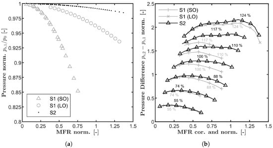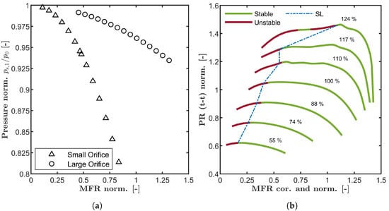 In this section, the surge limit for a compressor in an application-oriented environment will be determined based on steady-state CFD-simulations. The system represented by the stability model will be called System 1 from now on and is the turbocharger test rig at Tu Darmstadt. The setup and all of the specifications of this test rig have been published by Dielenschneider et al. []. The physical (constant) parameters necessary for the stability equation can be taken from Table 1. One additional detail should be pointed out here, again. The mass flow rate is determined by two differently sized orifices far upstream of the compressor inlet. The size of the orifice is chosen to be adequate for a certain mass flow rate range. Furthermore, the mass flow rate measurement system includes some additional components like air filter, piping and flow straightener. All together, these components are creating a pressure loss from ambient to the compressor inlet as a function of the currently selected orifice and the mass flow rate. The pressure characteristic, representing the pressure loss for the mentioned system, is depicted in Figure 3a for both orifice sizes. The pressure is normalized by the ambient pressure. The pressure loss in the case of the small orifice is almost up to 15%.