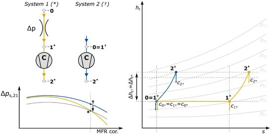 Saying that the total enthalpy rise and the entropy production of the compression process () equals for both systems and that an isobar can be expressed by an exponential expression () leads to the equation of the total enthalpy ratio, Equation (4). In this equation, is defining the enthalpy of an isobar at a reference state and thus setting the pressure level of this certain isobar. Reformulating the initial fraction results in the fact that the total pressure ratio is the same for both systems.