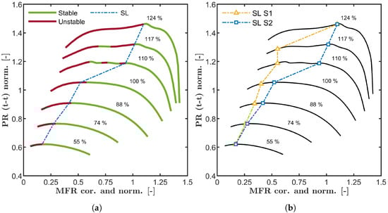 For the validation of the surge limit for System 1, two different regions in the compressor map need to be distinguished. In case of the 55% to 117% speedlines, there is only one surge limit. In case of the 124% speedline, two surge limits can be determined experimentally. Coming from the choke limit, the first surge limit will be reached. Beyond this limit (red dashed line, unstable), the compressor can not be operated safely. Referring to Figure 3b, there should be another stable area at lower mass flow rates according to the stability model. By accurately sticking to the speedline, this area is not reachable. But, as shown by the experimental data, this area can be reached by approaching it from a lower speedline, like shown by the black arrow in Figure 7a. Through this procedure, a second surge limit can be determined.