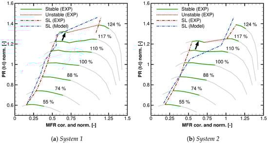 The results of the experimental investigation are depicted in Figure 7 for System 1 (Figure 7a) and System 2 (Figure 7b). The grey solid lines are showing a reference compressor map, which has been gained experimentally through a maximum reduction in the outlet plenum volume. The reference map is the same in Figure 7a,b. The green solid lines are showing operating points that have been measured for System 1 and System 2 and the color is indicating that these operating points are stable. By comparing the green with the grey lines in both cases, it can be confirmed that the total pressure ratio is unaffected by the compressor inlet pressure.
