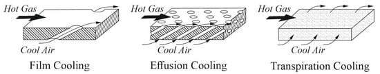 Schematics showing film, effusion, and transpiration cooling (adapted from [] with permission).