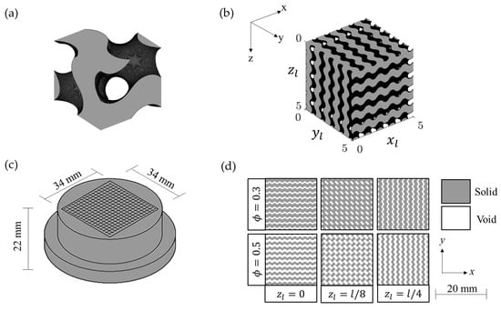 The test coupons featured a 34 mm × 34 mm × 22 mm porous region, as shown in Figure 2c. The porous region was constructed from repeating gyroid unit cells. Gyroids are commonly approximated in Cartesian co-ordinates by the following equation []: