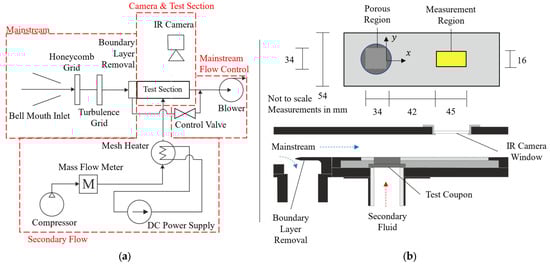 Figure 3a shows a schematic of the test facility; a detailed view of the test section is provided in Figure 3b. The test coupon was installed in the wall of wind tunnel with a 54 mm wide and 30 mm high cross-section in the region of interest. Air was drawn through the wind tunnel by an inverter-controlled side-channel blower; a bell mouth inlet was used to accelerate the flow into the test section, with the boundary layer removed upstream of the test coupon. The mainstream flow velocity was taken from pitot-static measurements. In this study, was maintained at 87.5 m/s (~0.27) throughout and so all presented data are for incompressible flow conditions. The boundary layer followed a 1/7th power law distribution for a turbulent profile with thickness 3.63 mm.