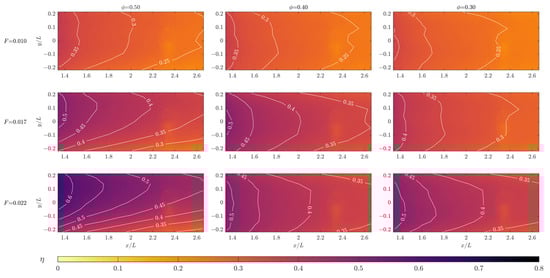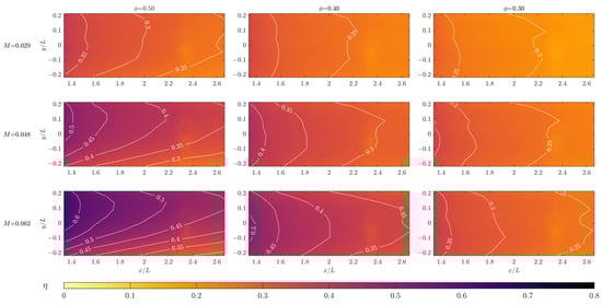 Figure 4 provides contour plots of adiabatic effectiveness for test coupon porosities of 0.3, 0.4, and 0.5, at blowing ratios of 0.024, 0.048, and 0.062. These blowing ratios were selected to replicate those used in the transpiration cooling study of Fier and Bogard. Note that the columns and rows of the 3 × 3 plots in Figure 4 are organised into constant values of porosity and blowing ratio, respectively. The streamwise length of the porous region (34 mm) was taken as the length to normalise the streamwise, , and pitchwise, , locations in the plots. Taking at the trailing edge of the porous region and at the centre of the coolant jet gave a dimensionless measurement region of and .
