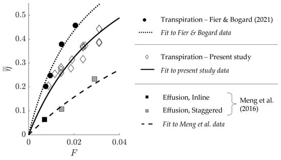 Advances in AM will facilitate new effusion and transpiration cooling designs. Assessing the relative thermal performance between these new designs (and with existing designs) needs to be conducted in a meaningful way if cooling system designers are to make informed decisions. As the results of this study have shown, injection ratio is a more meaningful parameter for assessment of thermal performance than blowing ratio. Given this finding, injection ratio has been used as the independent variable for comparing area averaged adiabatic effectiveness results from this study with those in Fier and Bogard [], and Meng et al. [], as shown in Figure 7. These previous studies were chosen as they enabled ready comparison of area averaged adiabatic effectiveness over the same dimensionless streamwise length range as the experiments here. Fier and Bogard tested a mesh-like transpiration setup with ; Meng et al. [] tested inline and staggered multi-row effusion cooling setups. Porosities for the setups in Meng et al. [] were calculated for staggered and inline arrays in accordance with the recommendations of Courtis et al. [], where and are streamwise and pitchwise hole spacings, respectively (normalised by hole diameter). Porosities were calculated independent of injection angle to enable simple calculation of injection ratio from blowing ratio using .