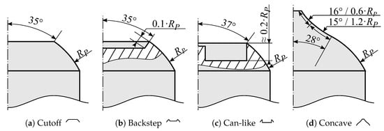 Early investigations link the core flow to increased instability and noise, whereas an annular flow, separated from the head and attached to the seat and diffuser, was found to be more stable [6]. Attempts to stabilize the flow by geometric modifications often focused on these key flow patterns and force a flow detachment from the valve head by introducing a separation edge. Similar shapes can be found in more recent literature, especially with industrial backgrounds (e.g., [7,8,9]).