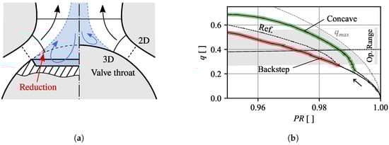 As visualized for the spherical and Backstep geometry in Figure 4a, the position of the smallest flow section of the three-dimensional (3D) geometry does not align with the tightest gap between valve head and seat (2D). As the flow passes the gap, the downstream flow section is further reduced as the radial distance to the valves center line decreases, even though the cross section suggests a diverging flow path. For larger valve openings, this effect is enhanced; as a result, the actual throttle area for the reference design moves past the location of the separation edge, as sketched for the Backstep geometry (left side of Figure 4a). Assuming that the flow direction remains unchanged during separation, the introduction of the separation edge therefore reduces the effective valve throat in comparison to the spherical shape and results in significantly reduced flow rates previously observed in region (a) in Figure 3a–c. Based on this finding, the Concave geometry was designed to maintain or improve the initial flow rate by reshaping the valve head to follow the boundary of the assumed recirculation area of the spherical valve (dashed blue line in Figure 4a). The result is clearly visible in region (d) in Figure 3d and shows that subsonic flow rates are in part significantly increased compared to the reference (and other) geometries, while maximum (choked) flow rates are maintained.