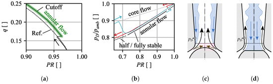 Also linked to the separation edge, an inverse behavior is observed in region (b) in Figure 3a–c. At supersonic flow conditions below , an under-expanded flow condition is expected at the separation edge, resulting in an expansion of the flow into the former recirculation zone. In contrast to the reduced flow section discussed in Figure 4a, the expansion is expected to increase the effective throat and thus slightly increasing the flow rate. Because this region is far outside the expected range of field applications, it is not further discussed within this paper.