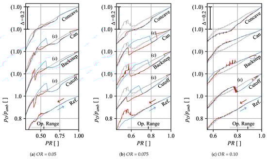 Consistent with the literature, the operating point of the valve is defined by the opening ratio (), representing the absolute valve lift H normalized by the reference diameter , and the pressure ratio (), defined by the ratio of the outlet static pressure, here specifically the ambient pressure in the test facility, to the inlet total pressure . At the test rig, arbitrary combinations of and can be investigated, and for all geometries flow characteristics were derived, provided in Figure 3.
