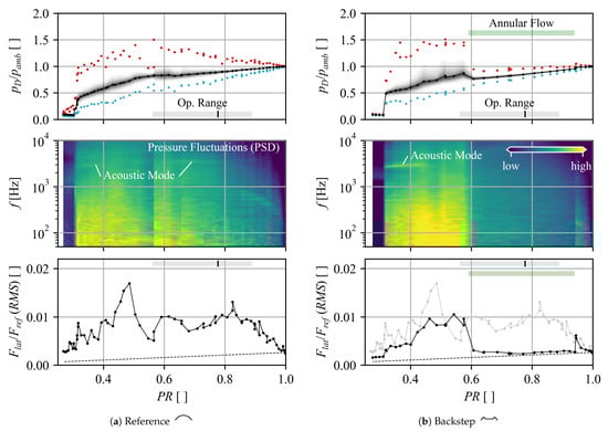The power spectral density (PSD) of the same pressure signals is shown in the second row in Figure 7 for th-octave bands, indicating a continuous increase of low frequency broad band amplitudes as the pressure ratio is decreased for the reference design. In this low frequency region, large vortex structures as discussed in Windemuth et al. [13] are observed in CFD results, showing slow and random propagations. The modified Backstep geometry shows a similar distribution of amplitudes outside the range of the annular flow. Within the range of the annular flow, a drastic reduction in amplitudes is captured across all frequency bands, spontaneously increasing back towards the reference level once the flow detaches again.