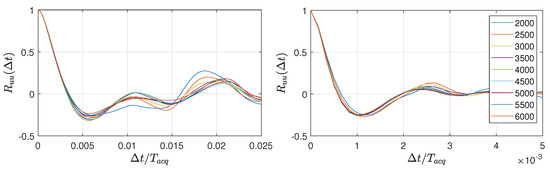 Figure 3 shows exemplary auto-correlation functions for low (left) and high (right) Reynolds numbers at the maximum pressure gradient and the lowest