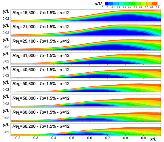 = 12 for a variable Reynolds number. This latter is the parameter showing the greatest influence on the definition of the bubble state (i.e., short and long one). Similar time-mean velocity distributions were indeed observed for the other combinations of the pressure gradient and the