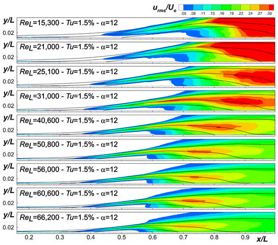 Figure 4. The region where the maximum rms values occur is seen to move downstream as the Reynolds number is reduced, according to the increment of the bubble length. Additionally, the saturation level of the rms of fluctuations becomes increasingly higher as