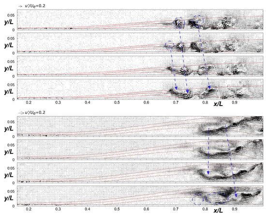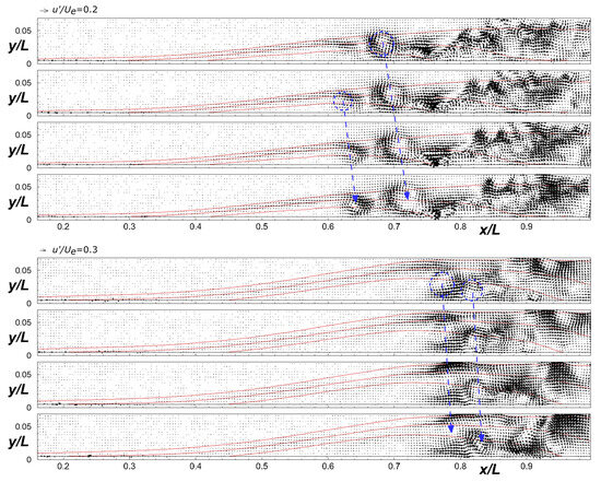 The present section reports exemplary PIV snapshots to highlight the main structures driving the transition process of an LSB as well as changes in the shear layer stability properties due to bursting occurrence. Since the bubble state has been found to be mostly affected by the flow Reynolds number variation,