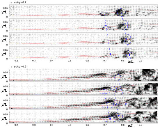 Figure 7 illustrates the typical pattern associated with the Kelvin–Helmholtz (K-H) instability process, driving the convective growth of disturbances in short laminar separation bubbles and the subsequent turbulent reattachment of the boundary layer. In contrast, the bottom plot in