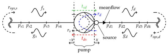 Finally, a change in the acoustic variables from and to and is needed to obtain the transmission parameters in the form of the scattering matrix . The necessary conversion rules can be found in []. Note that the lengths for pipes (s) and (d) are set to a negligible value of to consider the cross-section jumps between piping and pump ports within the TMM calculations.