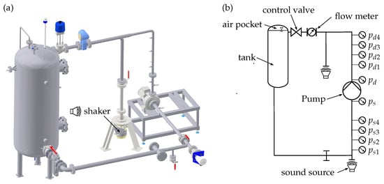 In Figure 2, the experimental setup is illustrated. The pump under test is a radial, single-stage centrifugal pump with a volute-type casing. The pump is speed-regulated and the specifications are listed in Table 1. For high-resolution pressure measurements in water, piezoelectric (PE) transducers Kistler™ (Winterthur, Switzerland) 7061 B/C are flush-mounted to the pipes’ inner walls on the suction () and discharge () sides of the pump.