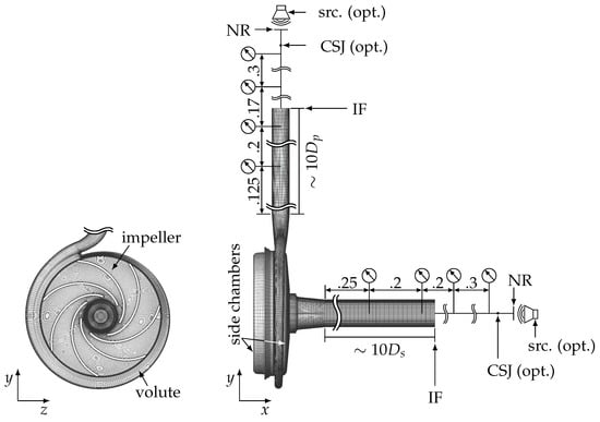 A centrifugal pump has two main acoustic characteristics [,]. One is the active generation of pressure pulsations. The other one is the passive transmission and reflection of sound waves propagating from the connected piping system into the pump’s suction or discharge flange opening, respectively. Excited pressure pulsations can have broadband and tonal characteristics. Broadband excitation mechanisms are, e.g., turbulence or cavitation []. Tonal pressure pulsations appear as sharp peaks in the spectrum, mainly at the rotational frequency and the blade-passing frequency and their higher harmonics. Especially in radial centrifugal pumps with volute casings, the pulsations at the are of the highest amplitudes []. The occurrence of pressure pulsations at the is due to two basic effects. Both result from the fact that an impeller rotates in a fixed casing. For an observer inside the housing right next to the impeller outlet, pressure and velocity alternate at . Because of that, the circulating pressure [] and velocity fields [,] within the impeller are primary sources which represent the two basic effects mentioned above. Furthermore, the fluctuating velocity field interacts in particular with the volute’s tongue []. This rotor–stator interaction (RSI) results in an equivalent acoustic dipole source []. In the first instance, the sources’ strengths depend on the operation point and rotational speed. Apart from this knowledge about sound generation mechanisms, the question of whether the acoustic sources in a centrifugal pump are independent of the acoustic impedance of the system to which the pump is connected remains partially unanswered so far.