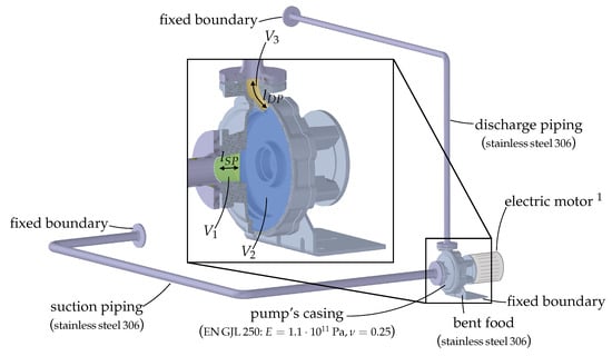 To evaluate the necessary parameters V and from the FEM results, the fluid volumes , , and within the pump are determined in the undeformed (index 0) and deformed (index ) cases. In both cases, it is important to use the discretized model to avoid the influence of discretization errors on the target parameters. This kind of error would have a great impact since is small and of a similar order of magnitude. The values of and for the middle part (volume 2) are both reduced by the rotor’s volume . Thus, the rotor neglected for the FEM can be considered again for the calculation of . However, the compressibility of the rotor, which is made out of cast iron, is disregarded. This simplification is legitimate since the compressibility of cast iron is , which is almost 35 times higher compared to water (). The volume change for all volume parts is calculated by means of . The resulting parameters are listed in Table 3. The largest due to is calculated for volume 2. The value of is comparable to the volume of an averaged-sized rain drop and seems, thus, rather small compared to . However, the effective speed of sound is significantly reduced to , and thus, the effect of the resulting additional compliance is very high. The pump’s suction and discharge ports are stiffer. even becomes negative in volume 3, which leads to an effective speed of sound which is higher compared to .