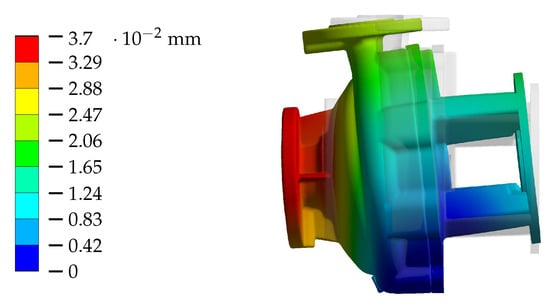 The rotor (impeller, shaft, and mechanical seal) and electric motor are not considered for simplification. The pump is connected to a simplified piping system. The flanges of the piping system and the bent foot of the pump are fixed by boundary conditions. The contact elements between the respective bodies are handled as bonded. No gravity is taken into account. According to experiments, the components’ materials are chosen. The stainless steel is of type 306 (, Young’s modulus ). The Young’s modulus of cast iron EN GJL 250 is set to and, therefore, to a mean value within the range of manufacturer’s specifications. The native Ansys Mechanical mesh generator is used. The overall element size is prescribed as . An additional refinement to element size for the pump’s casing is considered. The calculated mesh has about 444,000 tetrahedral elements with quadratic shape functions. To effect a linear elastic deformation of the casing and, therefore, a measurable volume change, the fluid pressure in the pump is varied up to one bar gauge pressure. The total differentials are and (according to Equation (14)), and so can be linearised to within this range of inner pressure load (this assumption was checked and confirmed within the relevant range of gauge pressure ). The resulting total displacements of the pump’s casing due to a change in fluid pressure of are illustrated in Figure 5. The two main causes of displacements are a tilting movement around the pump’s foot and a deformation of the casing, mainly in the areas of the sloping walls between the suction port and spiral contour. The effective speed of sound is influenced in particular by the last mentioned deformation of the casing.