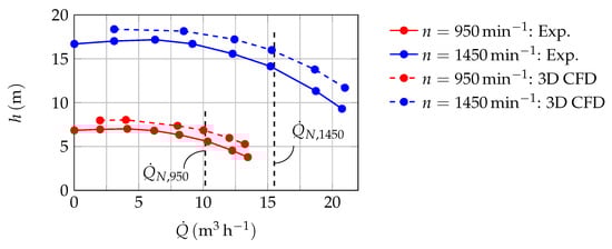 Pump’s characteristic head curves evaluated from experiments and 3D CFD simulations for two different rotational speeds. (Data: Supplementary Files S1–S4).