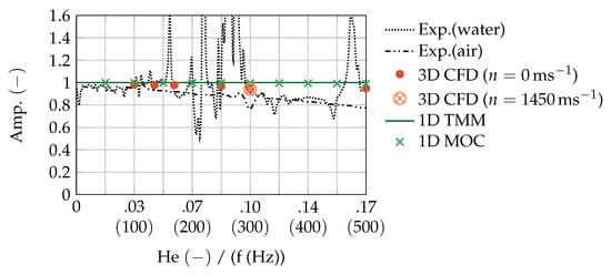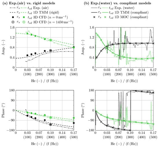If the rigid and compliant configurations (Figure 7b) are compared, there is a similar trend for the amplitudes of reflection to increase with higher and the reverse trend for the amplitudes of transmission. However, the decisive difference lies in the initial gradients of rigid and compliant cases in a range of . Due to the abrupt change in acoustic impedance caused by the compliant casing, incoming sound waves are much more strongly reflected compared to the rigid case. This statement is underlined with respect to the very good approximation of the experiments in water by the 1D TMM and likewise the 1D MOC (compliant) calculations. Nevertheless, it can be seen that the curves determined from experiments in water (Figure 7b) show partly erratic deflections which are not reproduced by the 1D model. It is assumed that this is caused by structural resonances of the entire system, consisting of pump, pipelines, tank, and other attachments. To summarise, this first part of the analysis conducted comparative analyses between rigid simulations and air-based experiments, as well as compliant simulations and water-based experiments, in order to isolate the effect of the fluid–structure interaction on the pump’s acoustic transmission characteristics. The results clearly prove the influence of a reduced effective speed of sound as a result of the casing’s structural compliance on the phase and magnitude of the transmission parameters in the frequency range of interest.