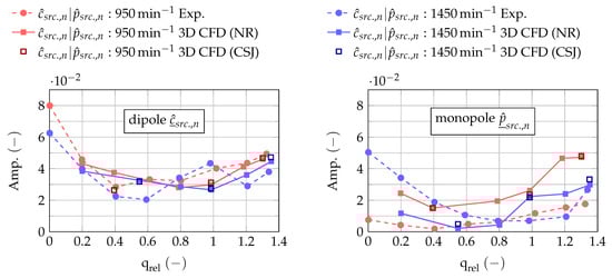 Amplitudes of normalised source term parameters for monopole and dipole at blade-passing frequency ( Hz) as functions of the relative flow rate evaluated from experiments and 3D CFD simulations for two different rotational speeds. (Data: Supplementary Files S19–S24).