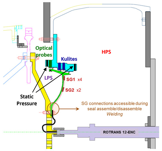 The instrumentation of the rig allowed determining both the steady state and the flutter appearance. Regarding the steady field magnitudes, the seal mass flow, static pressure at both inter-fin cavities and external high-pressure side (HPS) and low-pressure side (LPS) cavities, static temperatures and the shaft speed were recorded to describe the seal operating point. With regard to the unsteady magnitudes, dynamic pressure sensors were located in the inter-fin cavities, and a number of dynamic strain gauges were installed in the seal specimen in order to monitor the vibration amplitudes and detect the flutter onset. A sketch of the rig and instrumentation positioning is shown in Figure 1. Note that the flow direction across the seal is from right (HPS) to left (LPS).