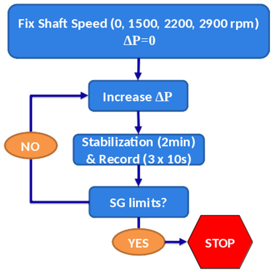Two main parameters were controlled while testing, namely, the rotation speed of the disk and the feed pressure to the HPS chamber. The testing procedure, described in Figure 2, consisted in setting the rotation speed of the disk to a chosen value, which will be kept constant thereafter, imposing a zero-mass flow state (i.e., set the feeding pressure to ambient value), and then increasing the feeding pressure giving small steps. After each of these steps, the time to reach a stable regime was waited, and then, the different sensor’s measurements were recorded. The process was repeated until the strain gauges were able to detect vibration amplitudes above the established safety limits, the moment at which the test was concluded. For each of the instabilities observed, the operating conditions, vibration frequency, nodal diameter (ND) and travelling wave sense were determined, allowing an easy comparison with the numerical results.