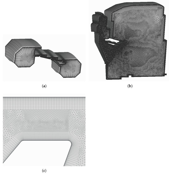 Figure 6. CFD domains and associated grids. (a) Computational mesh for the simplified domain. (b) Computational mesh for the complete domain. (c) Detail of the computational mesh in the fin-clearance region.