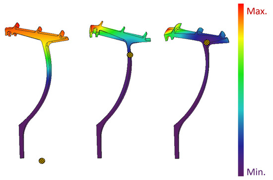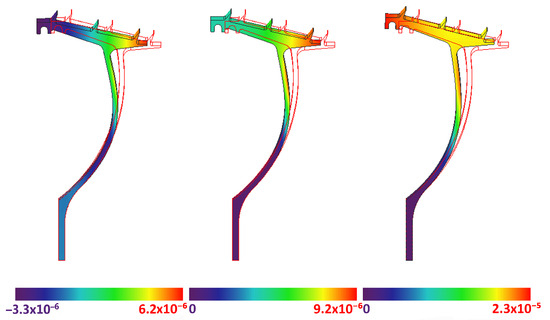 Figure 7. Contour of static radial displacements (m) of the baseline geometry. Shaft speed of 0 rpm (left), 1500 rpm (centre) and 2900 rpm (right).