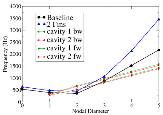 Regarding the calculated modal properties, Figure 8 plots the modal frequencies of the two specimens along with the acoustic frequencies of the seal cavities, both the forwards and backwards travelling waves. The numeration of the inter-fin cavities follows the flow direction from right (HPS) to left (LPS). Focusing on the vibration frequencies, the two-fin seal exhibits higher frequencies than the baseline configuration, mainly due to its lower mass at the fin head. The other characteristic that should be pointed out is the trend of the curves. As the reader can observe, the behaviour of the frequency against the nodal diameter is very similar to that found in disk modes, which should not be a surprise given the kind of structure we are analysing. It is well known that increasing the nodal diameter number imposes more restrictions to the disk displacements, which in turn produce a stiffening effect in the structure and an increase in the natural frequencies. It has to be mentioned that measured instabilities show discrepancies of 2–3% in frequency when compared with the predicted values, which is considered acceptable.