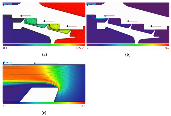 Figure 11. Steady solution from CFD. Baseline geometry operating at 2900 rpm, ΔP = 0.1251 (MPa). Arrows indicate the flow direction, from right to left. (a) Static pressure (MPa). (b) Mach number. (c) Detail of the left-most (last) fin clearance. Mach number.