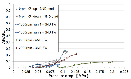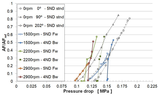 The experimental measurements corresponding to the baseline and two-fin specimens are plotted in Figure 13 and Figure 14, respectively. In concrete, these graphs plot the vibration amplitude–frequency parameter (AF) as a function of the pressure drop across the seal. Note that AF values have been normalised with the maximum AF measured in all the campaign, using that same reference value in all of the plots. Each line represents the different nodal diameters detected, discerning between standing waves (stnd) and forwards (Fw) or backwards (Bw) travelling waves.