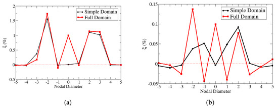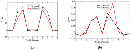 Regarding the agreement between simulations and experimental stability, we must highlight that the new results obtained for the two-fin geometry (shown in Table 7) perfectly match the experiments in all the operating points analysed. However, for the baseline configuration we obtain mixed results; while we are improving the matching in some aspects, (ND 4 is not predicted as unstable at 0 rpm or ND 5 instability is reduced to the forwards travelling wave at 2200 and 2900 rpm, in line with the tests) it seems we are over predicting the effect of external cavities over the ND 4 backwards travelling wave, which suffers a complete stabilization at 1500 rpm (see Figure 17a), in contrast with the experimental data. Here, the same comments as before apply. The ND + 4 is close to the stability limit (i.e., aerodynamic damping 0) and in an operating region really sensible to details. Therefore, it is hard to predict by the simulations.