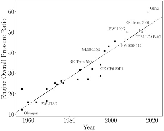 In the pursuit of enhancing the performance and efficiency of gas turbine engines operating with a Joule–Brayton cycle, the next generation of engines demands higher overall pressure ratios. Figure 1 shows the evolution of engine pressure ratio over time showcasing this trend. Current flying engines from major manufacturers are indicated with crosses in the figures, illustrating the ongoing efforts in this direction.