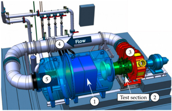 The experimental data were acquired in the R4 test rig of the von Karman Institute for Fluid Dynamics (VKI). The layout of this facility is depicted in Figure 3. This facility incorporates an inlet plenum equipped with a heat exchanger and honeycomb (1), which regulate the total temperature and flow homogeneity. The flow is then channeled to the H25 test section (2), via a smooth convergent bell-mouth. After passing through the test section, the compressed flow is released into a large collector (3). A return duct (4) connects this collector back to the inlet plenum, forming a closed-loop system. The facility includes a precision throttle valve (5) that enables the accurate control of mass flow.