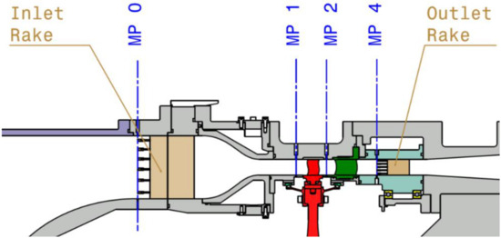 A meridional view of the H25 test section, labeled as point (2) in Figure 3, is presented in Figure 4. In this view, the rotating components are highlighted in red, while the stator row is marked in green. The instrumentation is axially distributed along four measurement planes, which are referenced as MP (Measurement Plane). MP0: Located after the convergent inlet bell-mouth, seven rotor chords upstream of the rotor. MP1: One chord upstream of the rotor. MP2: In the inter-row region between rotor and stator. MP4: At the stage outlet, one chord downstream of the stator blades.