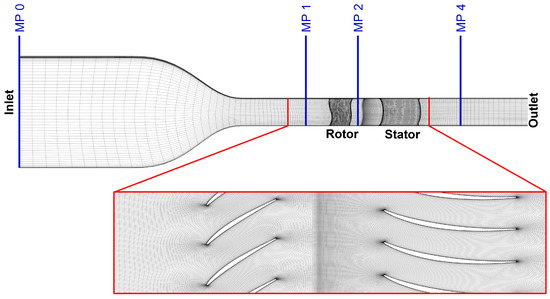 A CFD numerical model is used to integrate highly discretized flow data with the undersampled experiment in the modeling approaches described above, and thus the domain matching between CFD and experiments is critical. The simulation domain is extended from experimental MP0 to a location two rotor chords downstream of MP4. This avoids issues related to outlet boundary conditions at MP4.